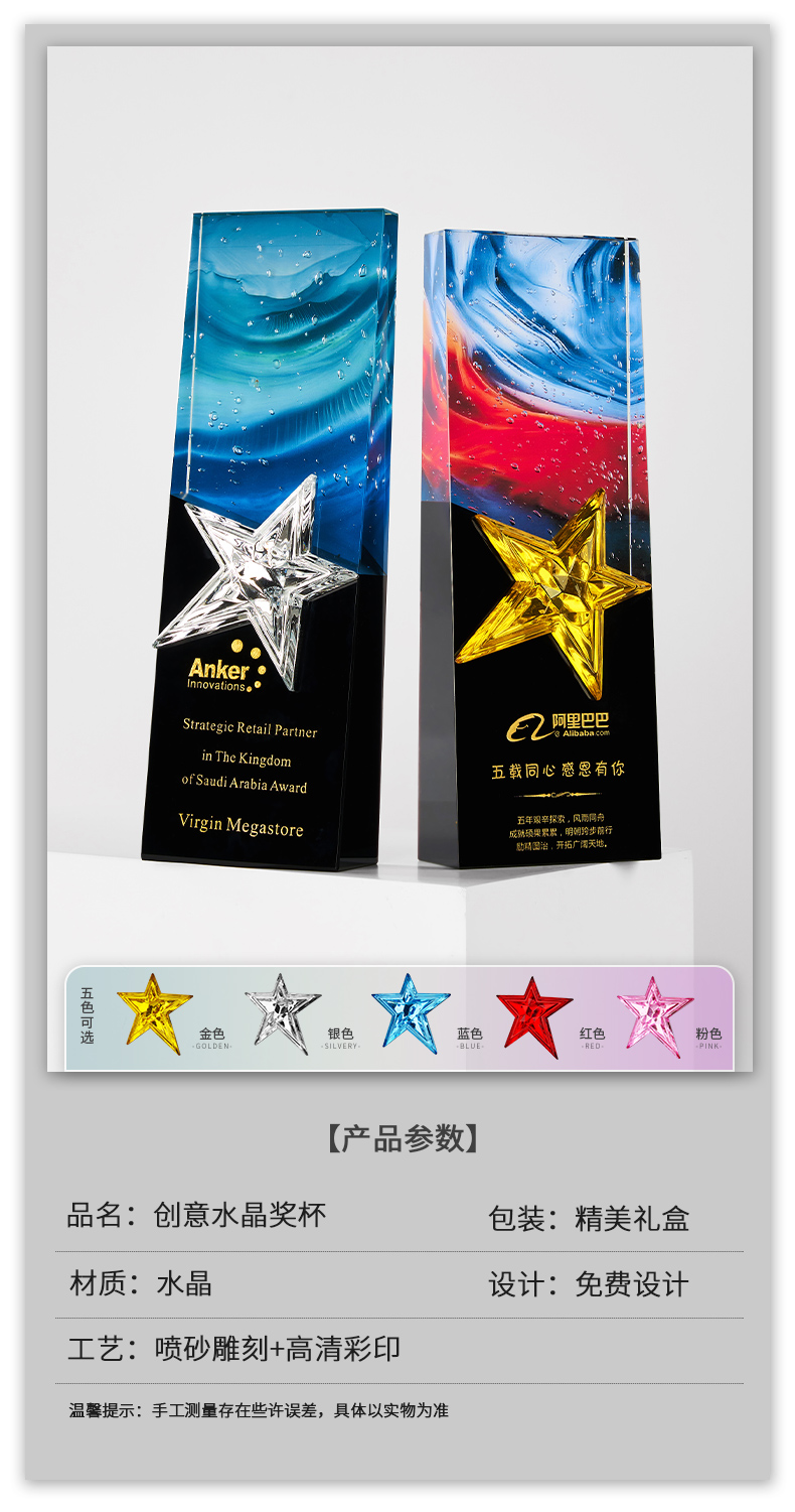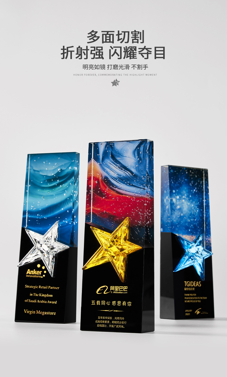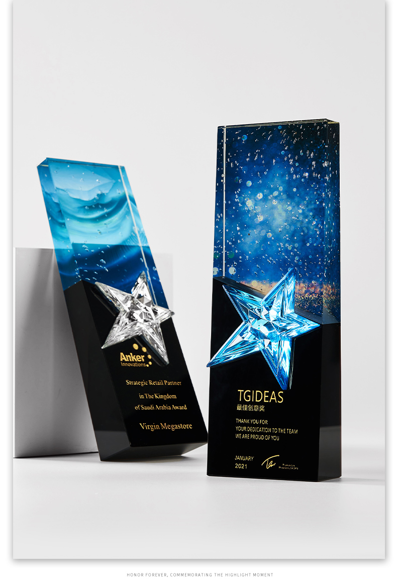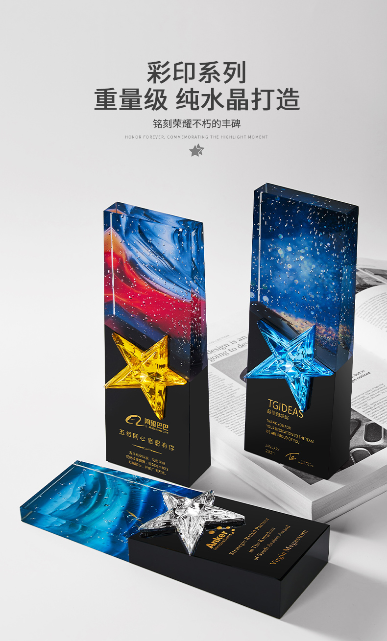 1034 / 高档大气炫彩水晶五角星奖杯定制创意刻字优秀员工颁奖表彰牌订制