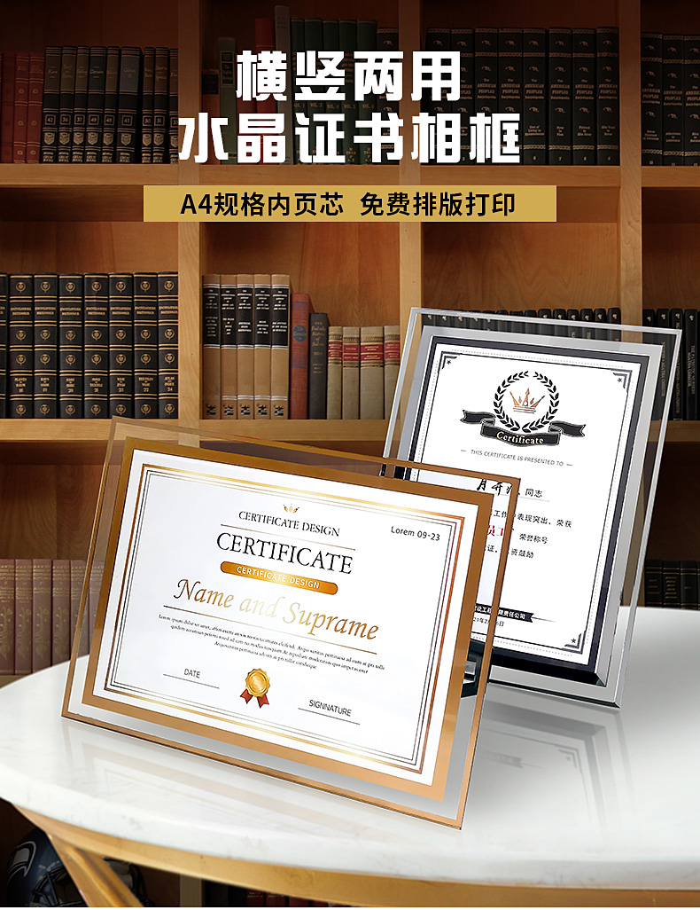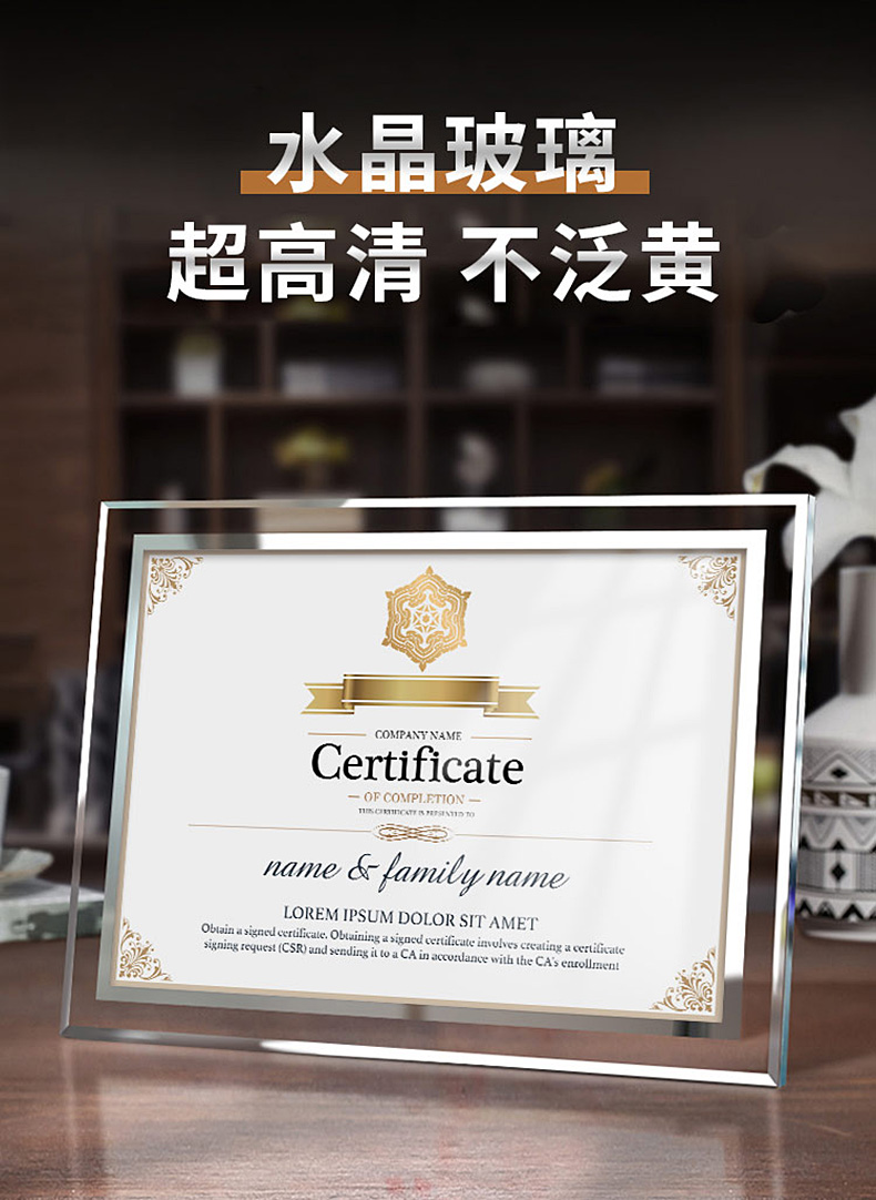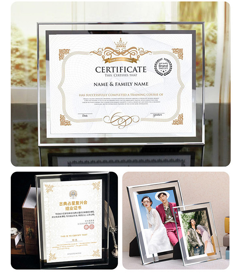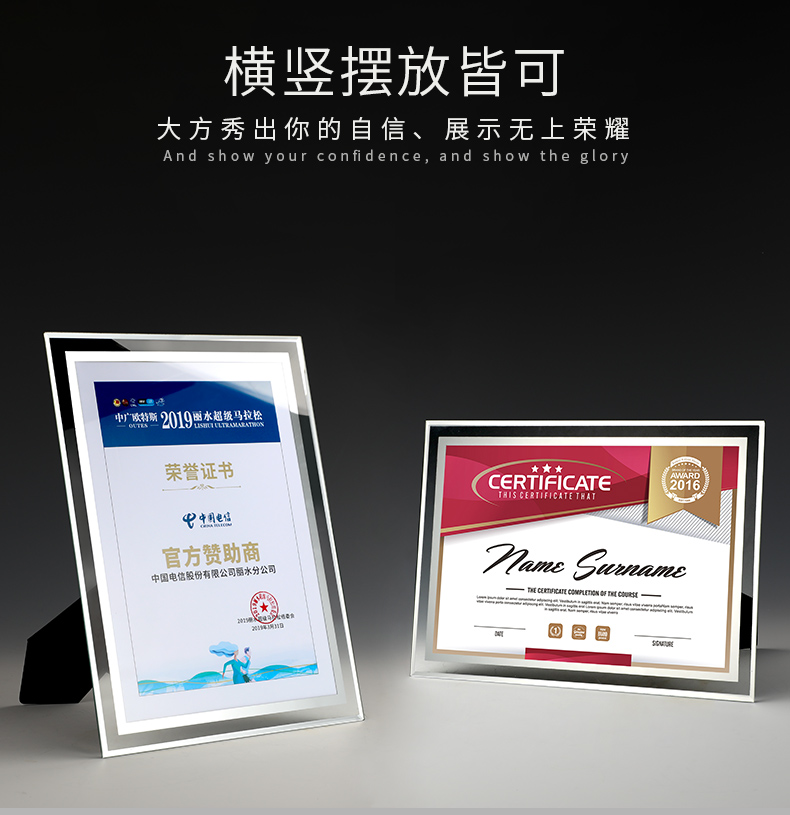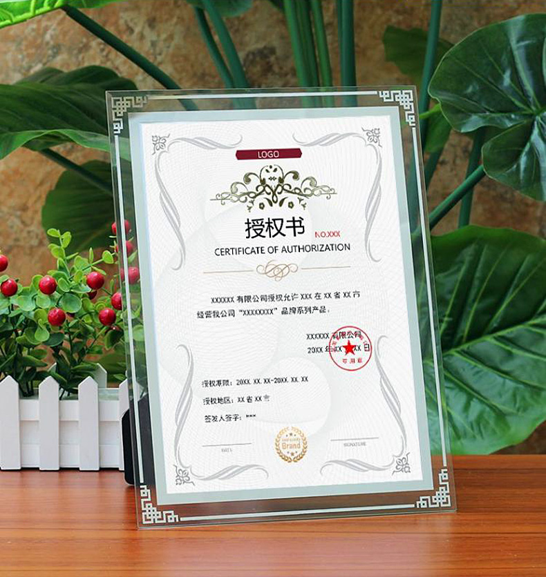 384 / 【透明水晶玻璃相框】6 7 8 12寸摆台A4授权证书12商标专利证书框挂墙