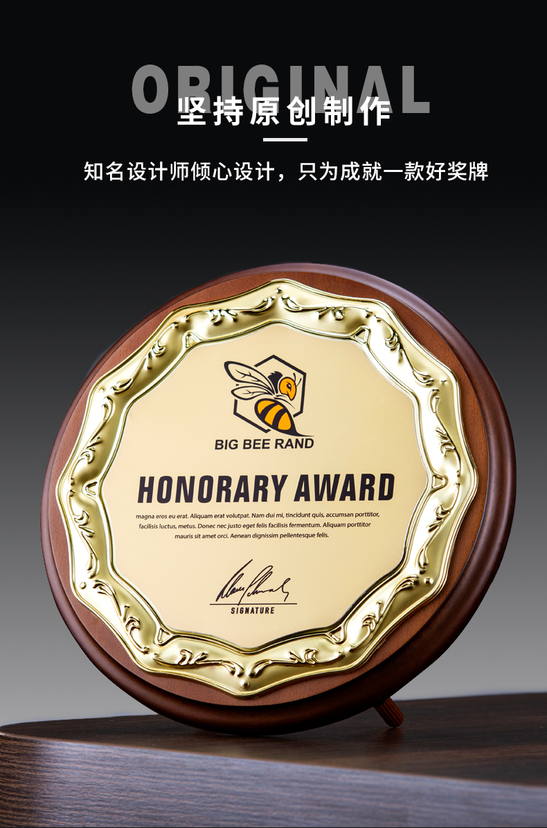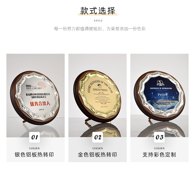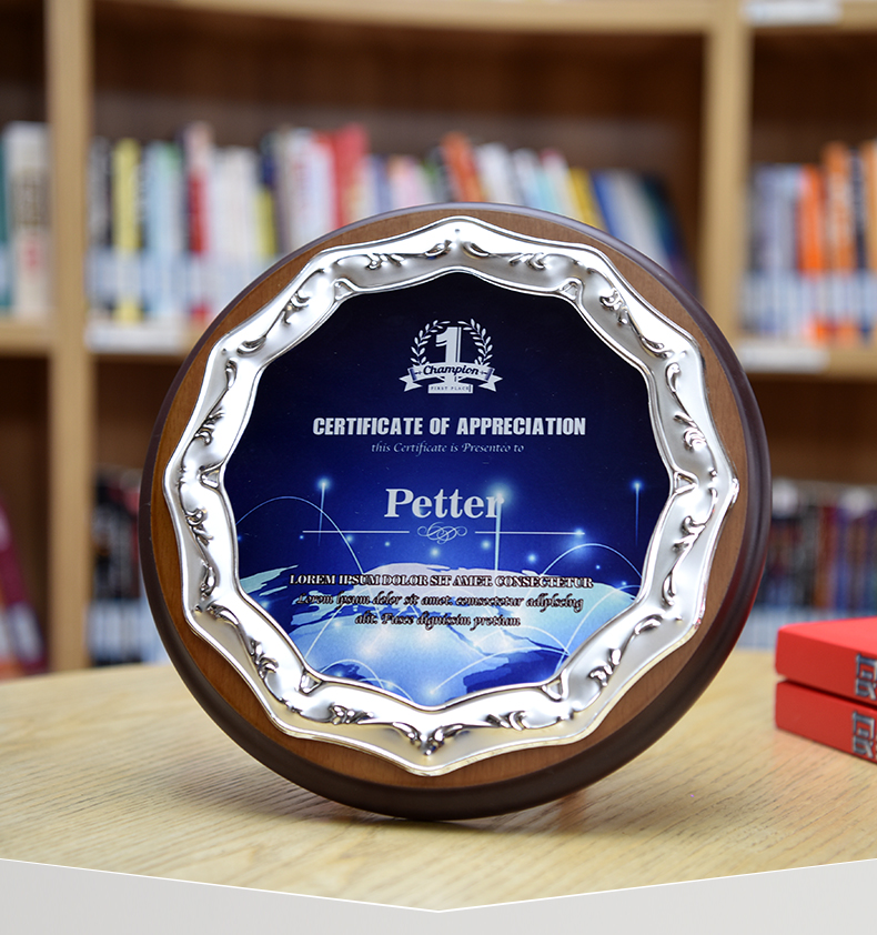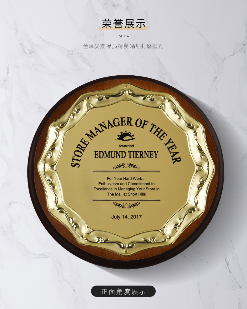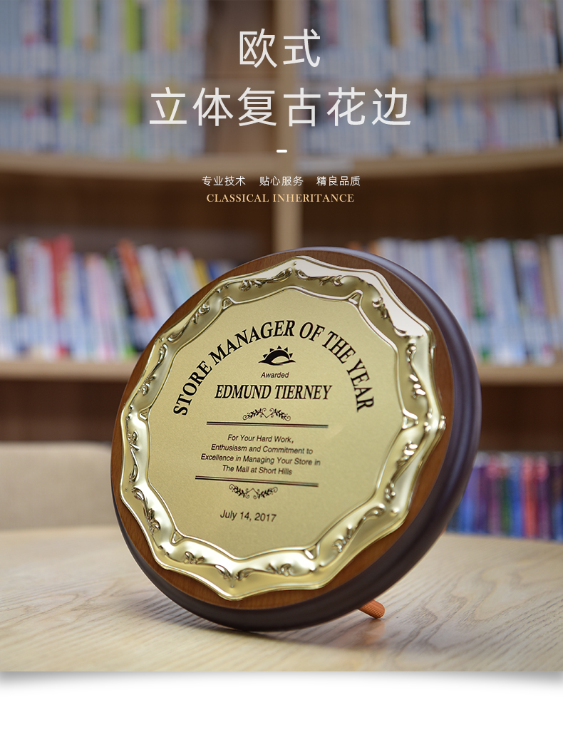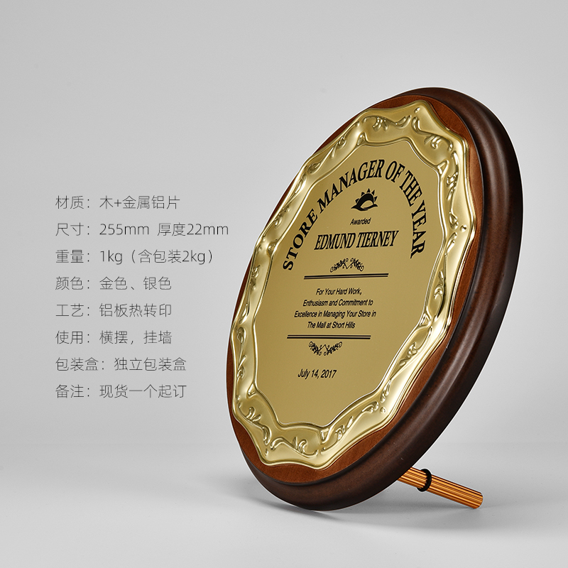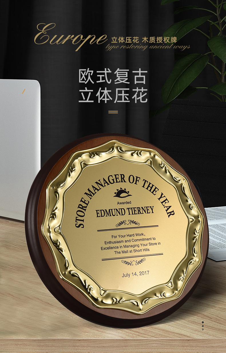 512 / 欧式压花奖牌创意金属圆形授权牌定制木质奖牌定做金箔退休荣誉牌匾证书铭晶坊