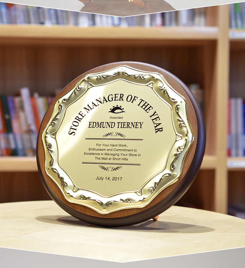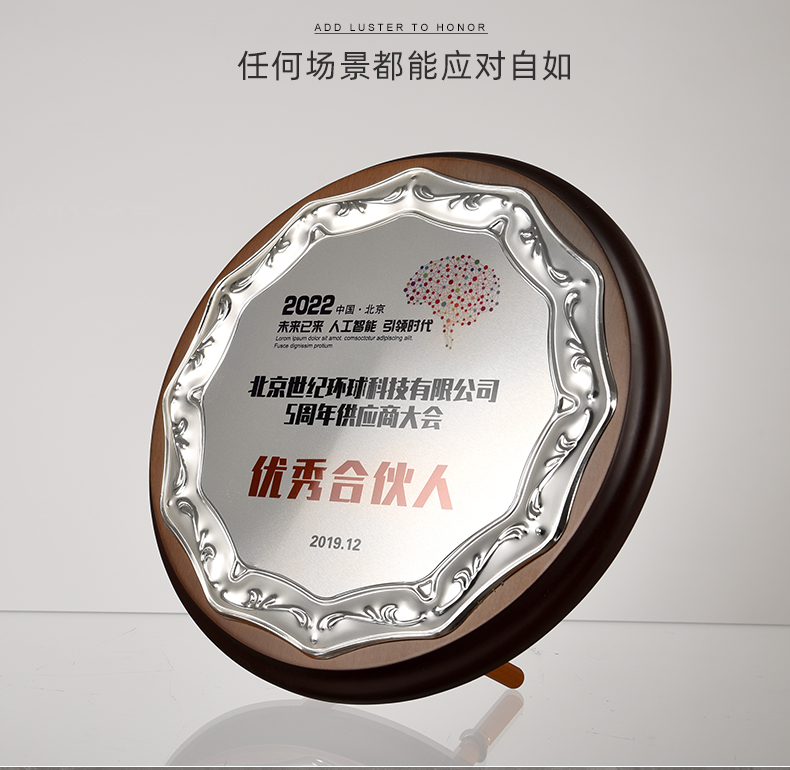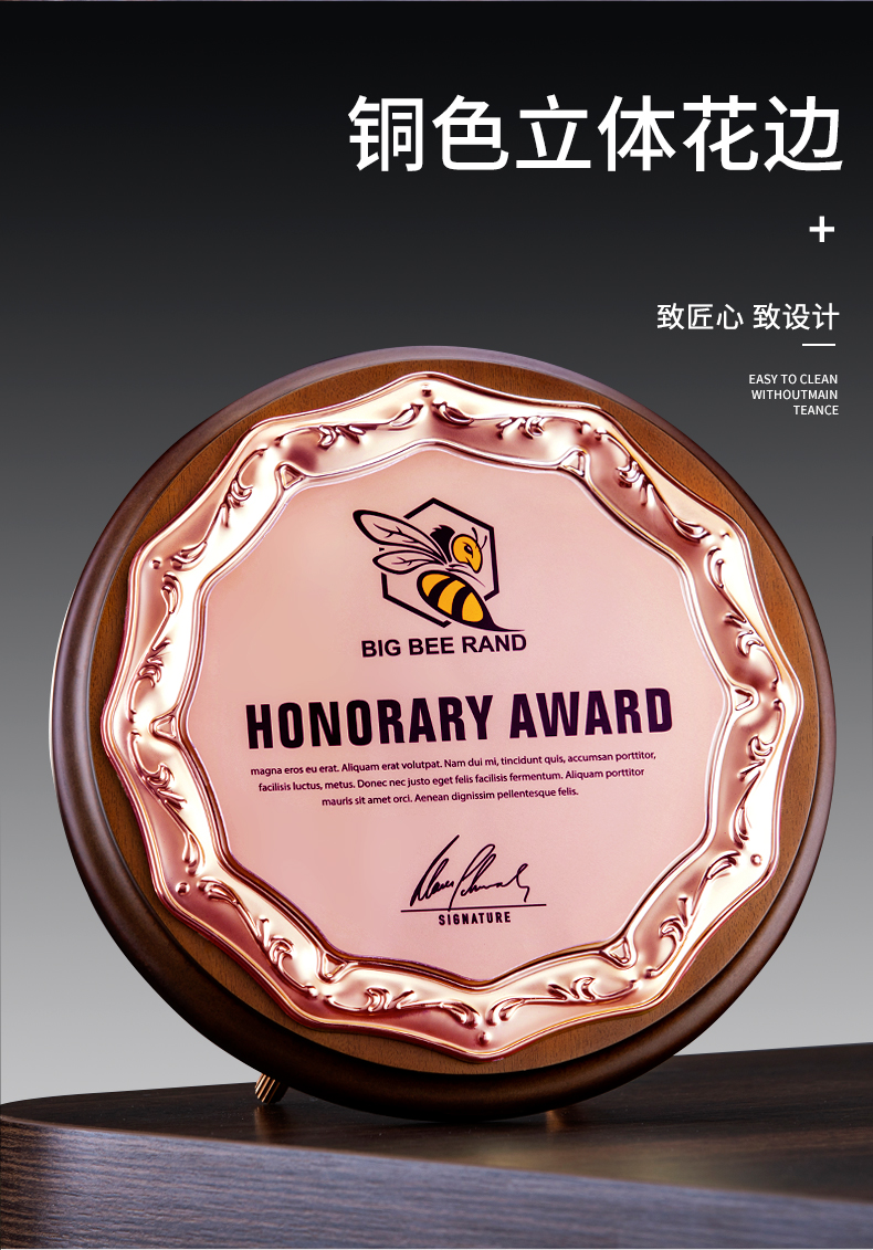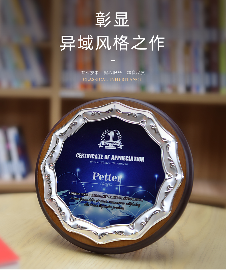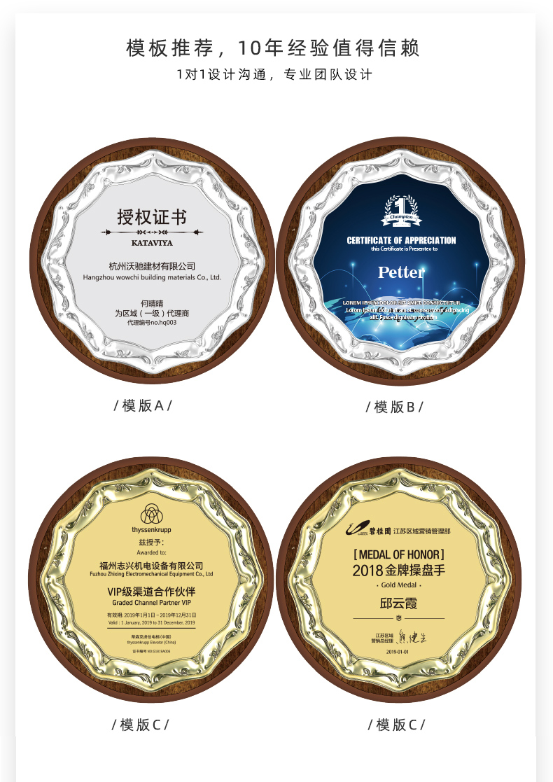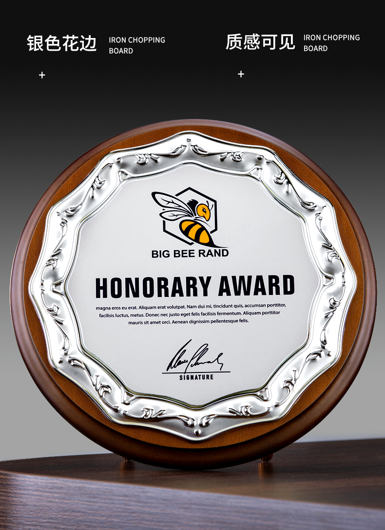 512 / 欧式压花奖牌创意金属圆形授权牌定制木质奖牌定做金箔退休荣誉牌匾证书铭晶坊