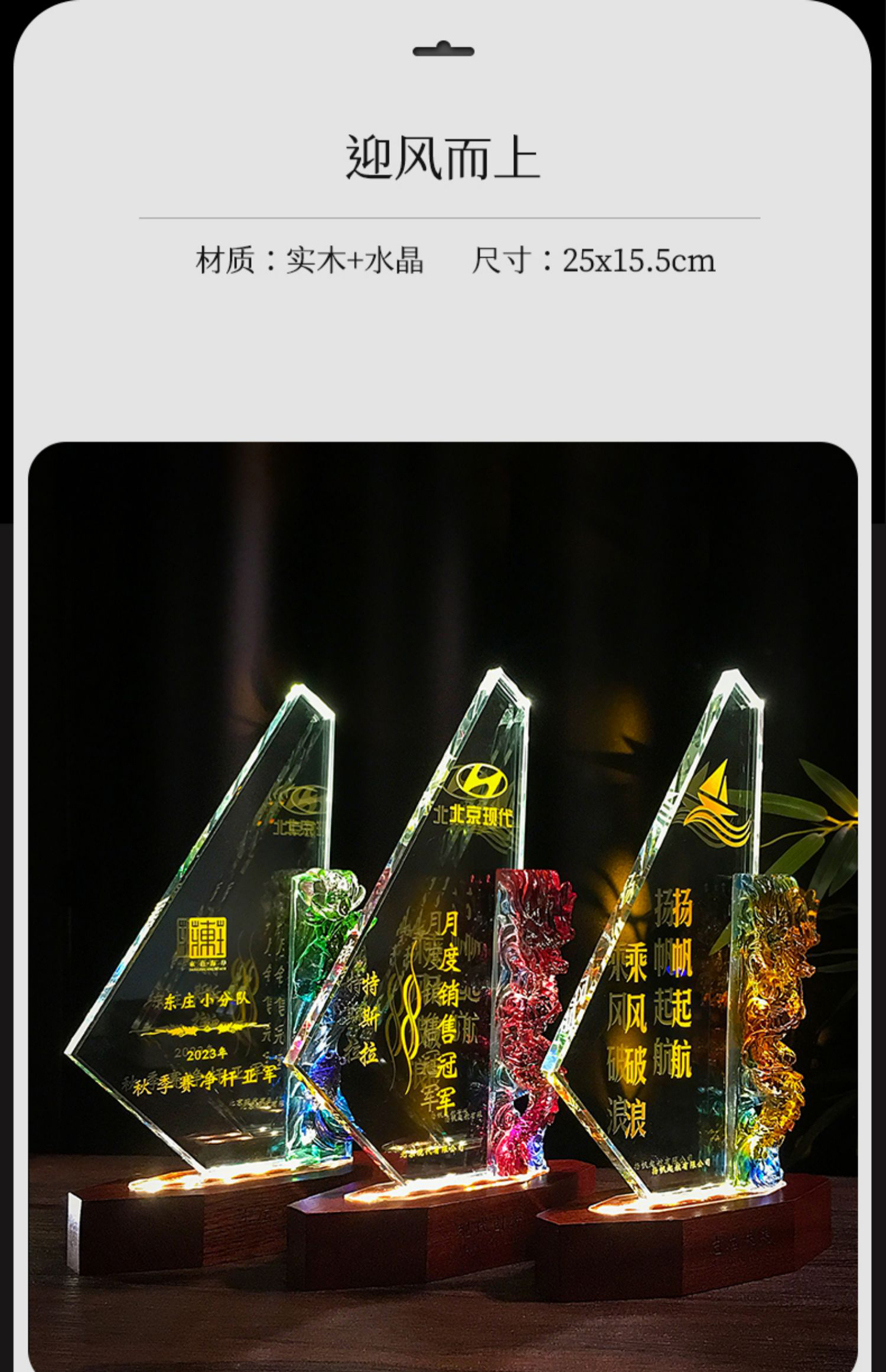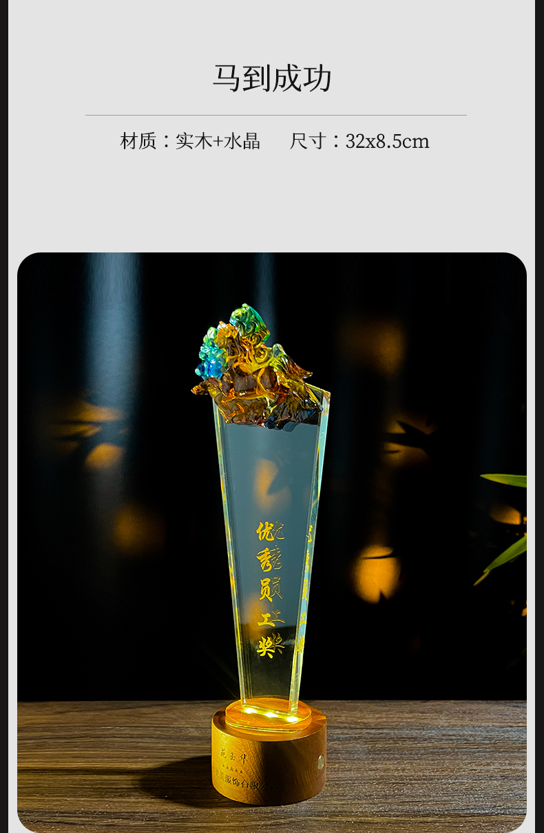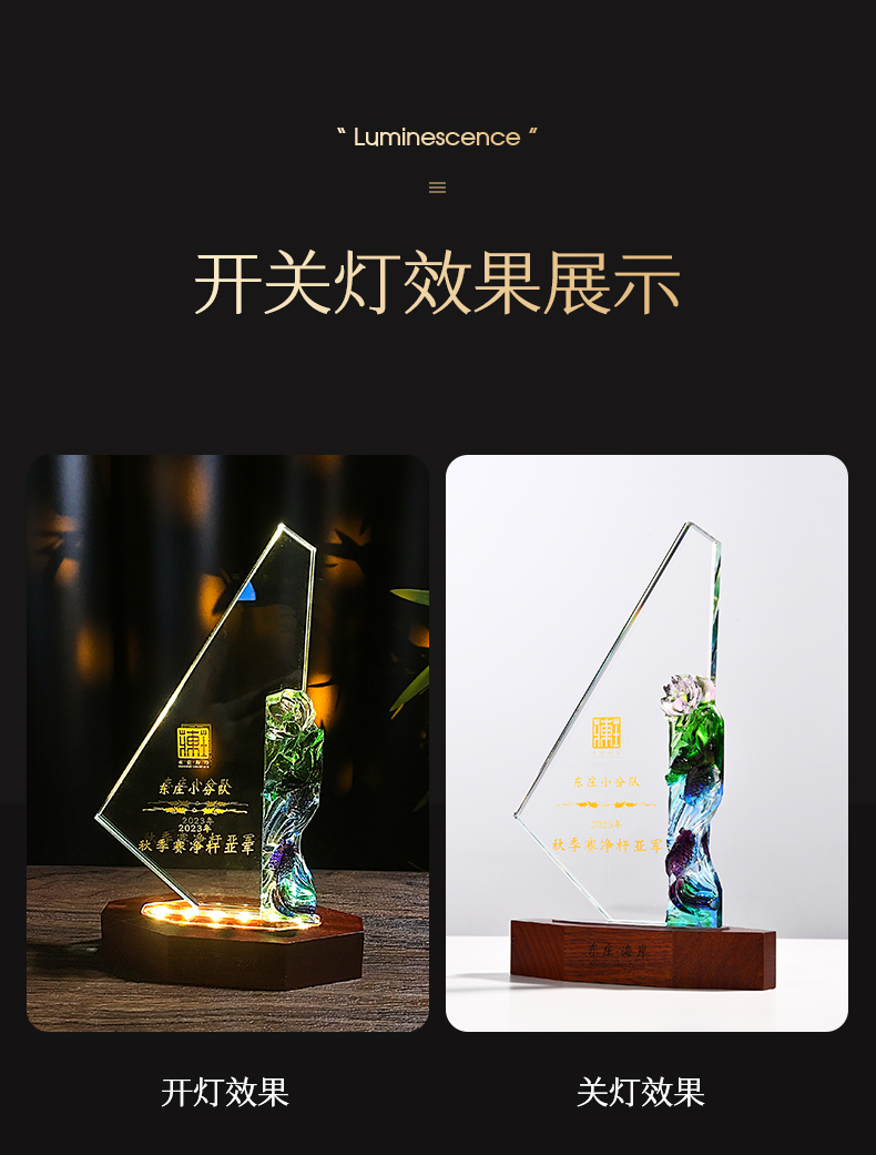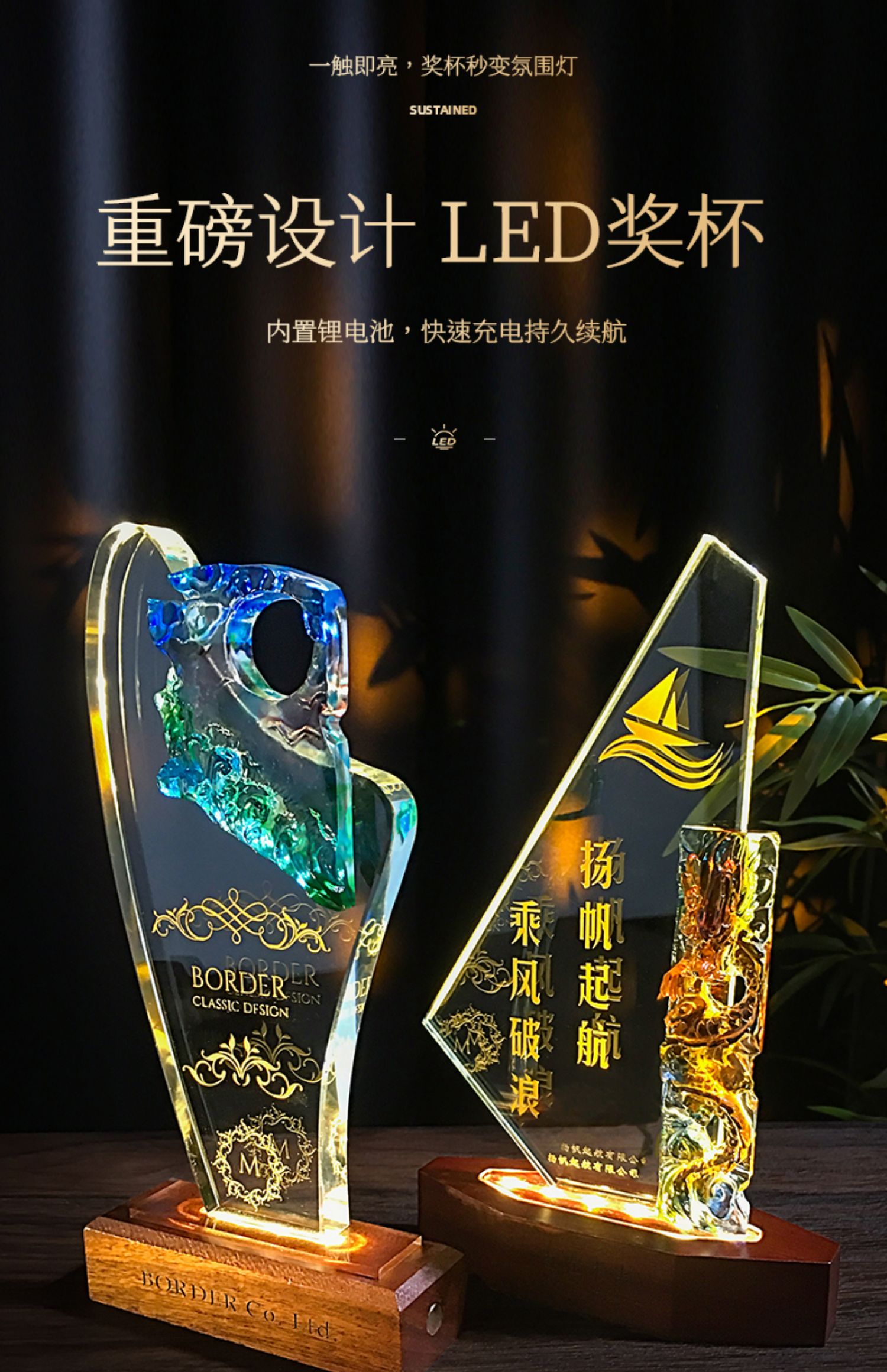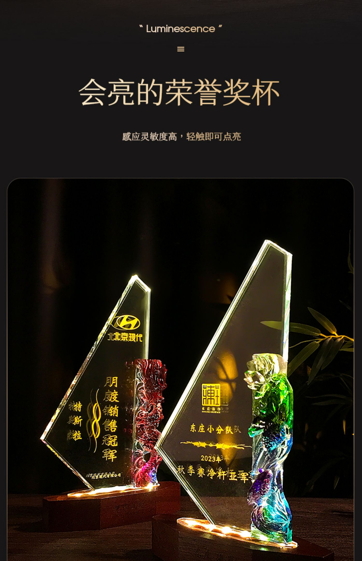 363 / 新款创意发光琉璃奖杯定制订做年会水晶奖杯实木年会优秀员工颁奖