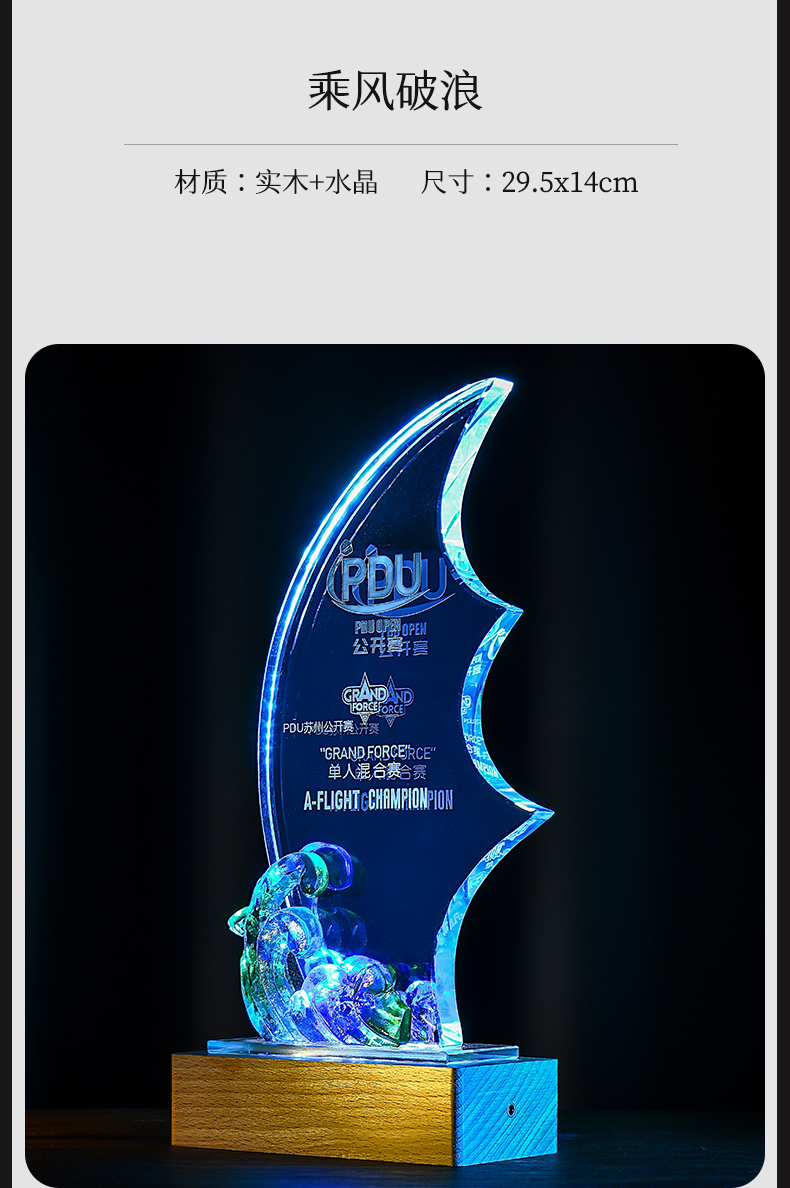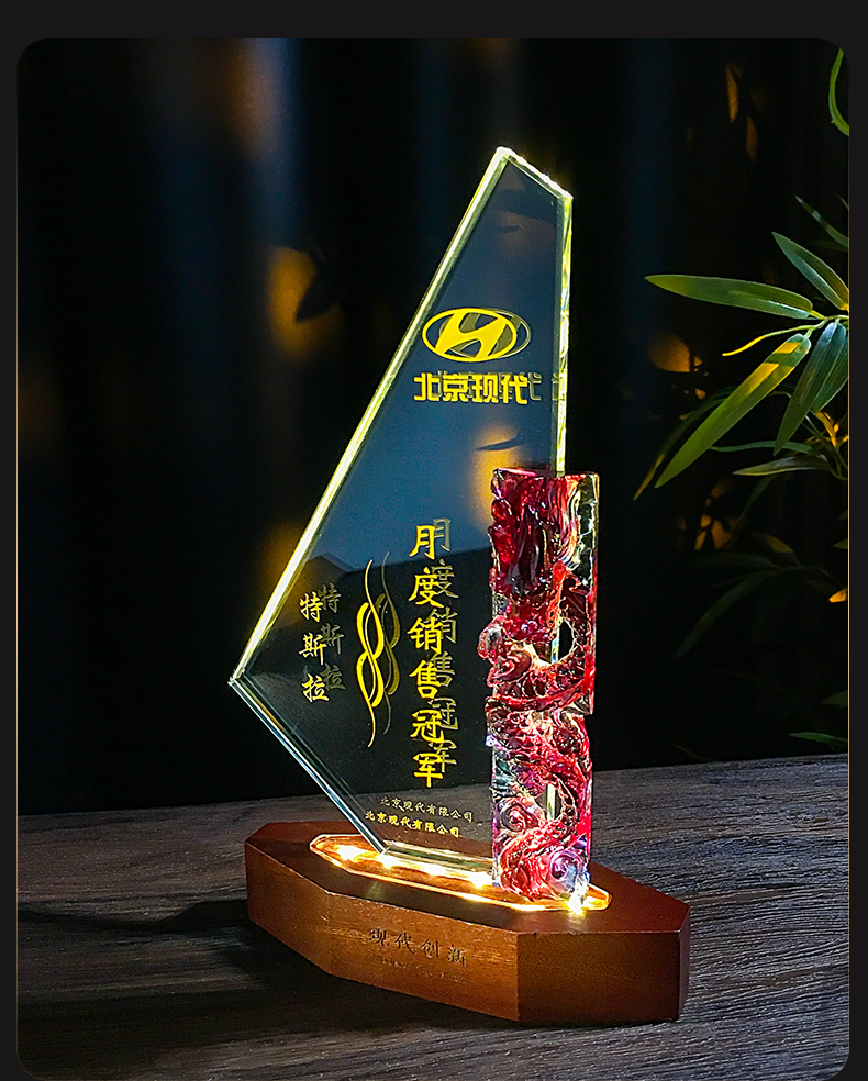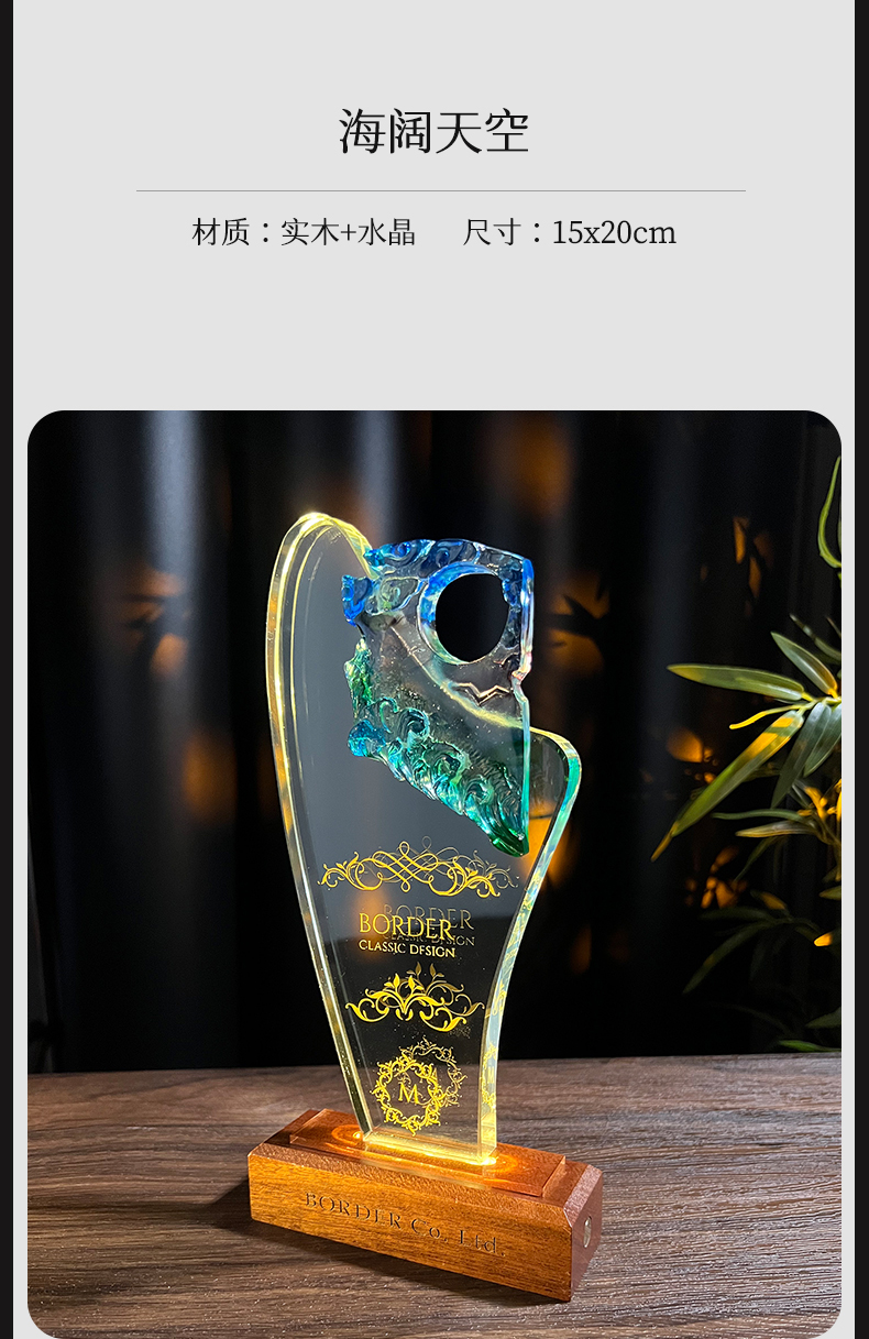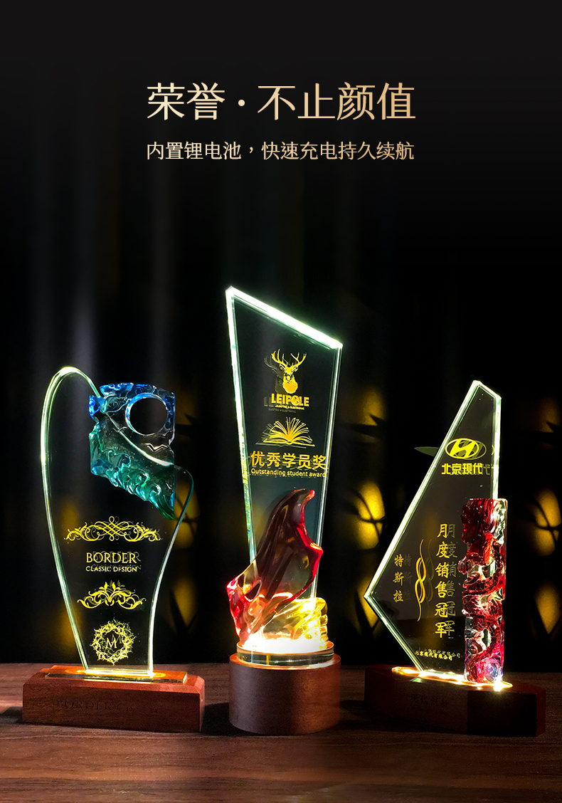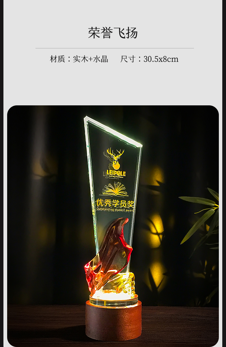 363 / 新款创意发光琉璃奖杯定制订做年会水晶奖杯实木年会优秀员工颁奖