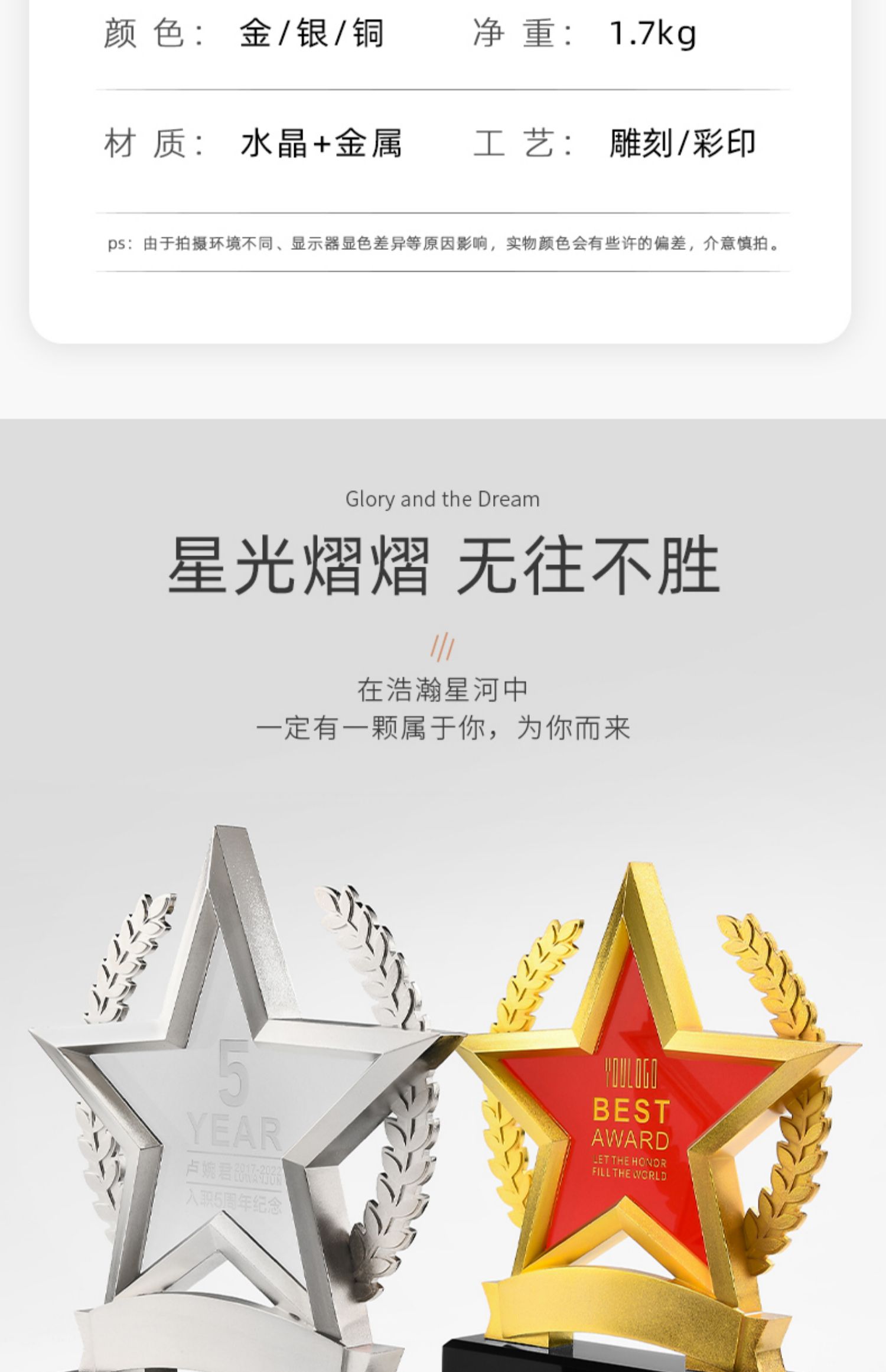 1098 / 红色五角星金属水晶奖杯定制金银铜订制创意志愿者纪念品优秀员工